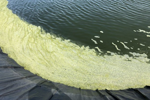 Ao nuôi có lớp bọt bông phía trên mặt nước. Ảnh: thuocthuysanvietduc.vn
